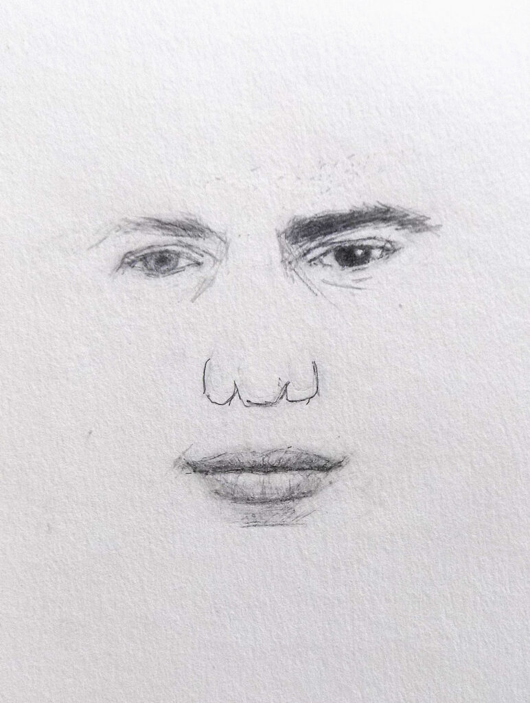 Through the beveled glass front door at my home, close up, I looked outdoors. Between the door and the pine tree near the cement walkway leading to the front door, around ten feet from the door, I clearly saw what looked very much like the sketch below. The image looked as if it were projected onto an invisible vertical plane. It appeared a bit larger than what the features on an actual face would be at that distance. It looked like a pencil drawing just as you see here, not at all exaggerated or enhanced. The lips were the most realistically rendered, the eyes less so, more sketch-like, and the nose appeared as it does in my drawing. I stared at it. It was definitely there. I walked away from the door and back again at least three times and it was still there. I don’t recall how long in total it lasted – around five to ten minutes.